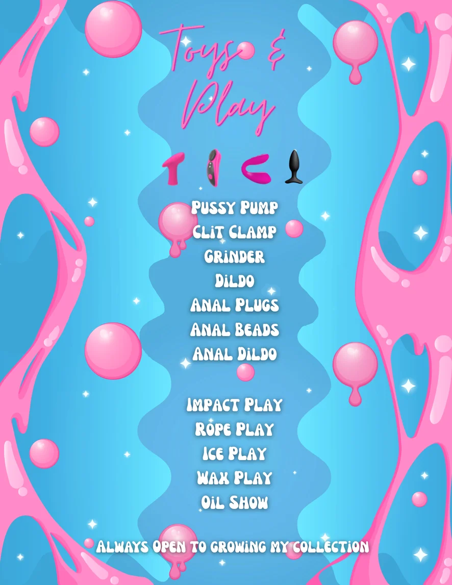 Топлесс, Шлепки, Секс-игрушки, Оргазм, Игрушки для сосков, Мастурбация, Засвет, Дилдо или вибратор, Глубокая глотка, Минет, Между грудей, Стриптиз